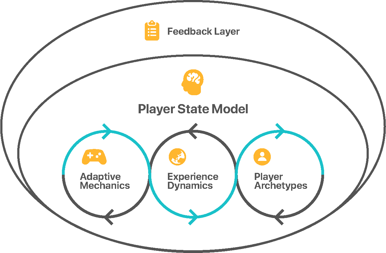 These are used to create a player state model for each individual player, which is constantly evolving based on the above parameters. This player state model is used for both the adaptive mechanics and experience dynamics.